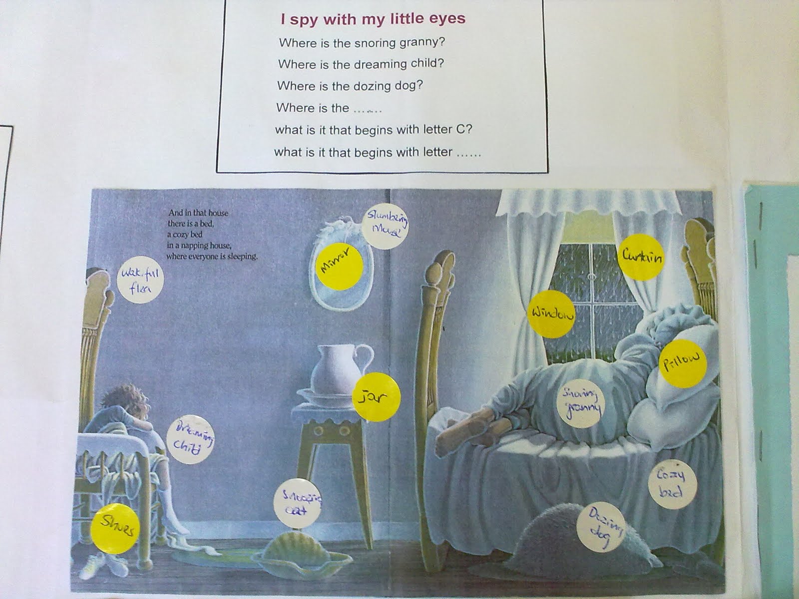 I spy with my little eyes something beginning with .. alphabet of the things (in yellow sticker); I spy with my little eyes things found in the picture (in white sticker)